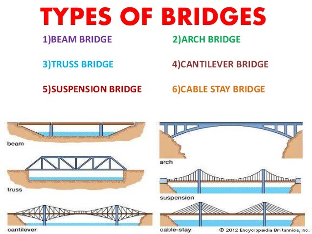 We will now take a look at the different types of bridges and how they work. This includes most simple suspension bridges and suspended deck suspension bridges and excludes self anchored suspension bridges. Different types of bridges.