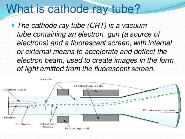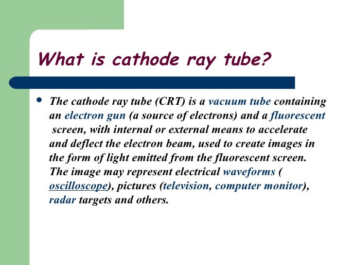 The images may represent electrical waveforms oscilloscope pictures television set computer monitor radar targets or other phenomena. Cathode ray tube definition is a vacuum tube in which a beam of electrons is projected on a phosphor coated screen to produce a luminous spot at a point on the screen determined by the effect on the electron beam of a variable magnetic field within the tube.